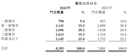 门店占比情况来看,除四线及以下城市占比提升外,其他等级城市占比较上年同期均出现不同下滑,其中一线城市占比下滑1.2个百分点,新一线城市占比下滑1.4个百分点。