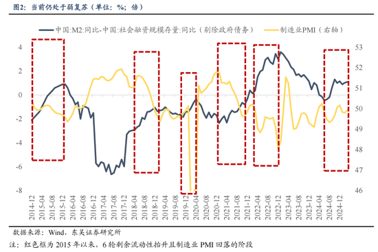 在经济复苏初期,央行会率先进行宽货币,而财政政策出台速度偏缓,落地推进的节奏相对落后。因此实体经济需求的复苏往往会滞后于货币供应的增加,使得大量流动性留存于金融体系中,造成剩余流动性的抬升。同时由于政策底已现,市场风险偏好改善,叠加小盘成长股的业绩弹性更佳,因此这个阶段市场会给予小盘成长股高估值。