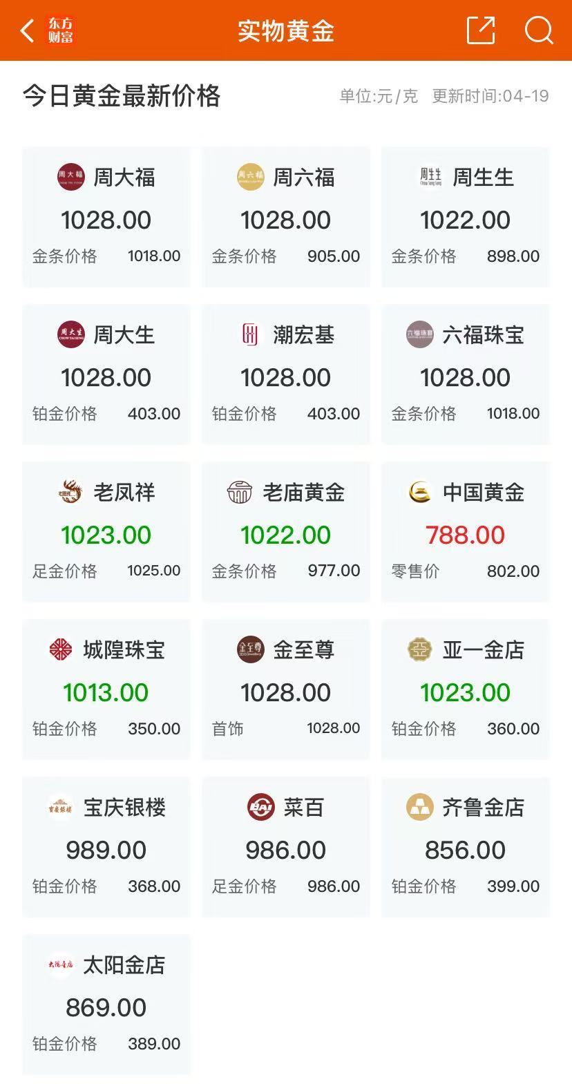 在零售端,截至19日,周大福、潮宏基、六福珠宝、周六福、周大生的首饰金价均为1028元/克,周生生、老庙黄金的首饰金价为1022元/克,老凤祥的首饰金价为1023元/克。