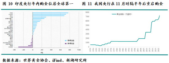 今年以来,各国央行购金的总体速度仍未停滞。在全球主权信用危机以及俄乌冲突以来去美元化浪潮的影响下,各国央行特别是发展中国家央行的购进需求直线上升。年初迄今,全球央行的购金量则与2022年同期持平,达到694吨,且购金行为普遍见于各经济体央行。其中印度央行购金量位居全球第一,土耳其其次,波兰第三,中国央行排名第四。根据世界黄金协会的数据,10月印度央行增持27吨黄金,推动其年初至今购金总量升至77吨,净购金量达到去年同期的5倍。印度卢比兑美元连年贬值,这可能推动印度央行增持黄金,稳定币值。我国外汇储备显示,时隔半年,我国央行在11月重启购金,增持黄金16万盎司,当前黄金储备为7296万盎司(约为2266.37吨黄金)。