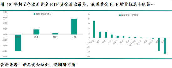 投资用金内部结构存在一定的变化,区域也呈现分化态势。 从存量上来看,全球黄金ETF的总持仓还是以欧美基金为主导,其中美国的持仓量遥遥领先于其他国家。但从年内持仓量变化来看,亚洲黄金ETF持仓量增长较快。其中,我国黄金ETF流入量位居全球第一,其次为美国、印度和日本,而德国和英国等欧洲国家的黄金ETF持仓量为净流出。不过,ETF资金流动随市场变化较大,例如在11月份美国大选结束后一周,美国黄金ETF的流出量为全球第一(流出超10亿美元)。总体来看,欧美和亚洲黄金ETF的流入趋势出现一定的分化,金价的定价权可能也会出现一些变动。