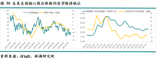 二是能源降幅收窄,商品通胀有所反弹。 由于地缘风险有所减弱,叠加去年同期基数并不高,本月能源相对CPI同比下行的贡献度有所减弱。另外OPEC+接连下调了全球石油需求增长预期,在全球经济放缓的背景下,市场对石油价格持悲观态度。随着特朗普上台,其承诺将解决地缘冲突问题,同时鼓励国内化石能源生产,可能仍会对石油价格形成压制。