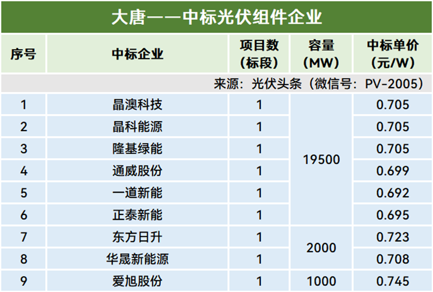 其中,中国大唐集团有限公司2025-2026年度光伏组件框架采购确定了中标人。项目采购规模22.5GW,晶澳科技、晶科能源、隆基绿能、通威股份、一道新能、正泰新能、东方日升、华晟新能源、爱旭股份9个企业中标。