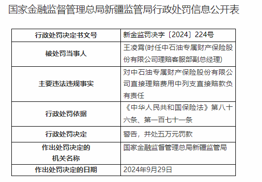 白建辉(时任中石油专属财产保险股份有限公司理赔客服部总经理)和王凌霄(时任中石油专属财产保险股份有限公司理赔客服部副总经理)对中石油专属财产保险股份有限公司直接理赔费用中列支直接赔款负有责任,被警告,并处五万元罚款。